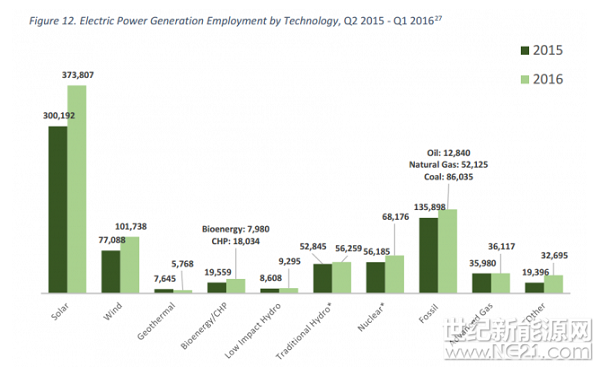 美国能源部“美国能源与就业报告”中一份报告中就指出,2016 年第一季的太阳能发电业相关业者达37 万人,占了能源业从业人数的43%,是能源业中比率最高,比前一年成长了25%。由此看来,太阳能发电业为美国创造了可观的就业数字。报告也指出,燃煤发电的发电量从2006 年到2016 年9 月之间减少了53%,且还在持续减少之中,同一时期太阳能发电量则提高了5,000%。