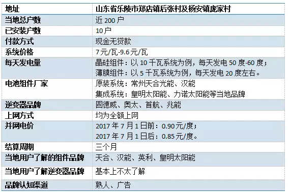 以本次调研地区为例,山东乐陵市总共安装了465套户用光伏系统。烟台莱阳县总共安装了900套户用光伏系统。而按照当地经销商估算,山东省累计户用系统在20000户以上。与浙江省衢州市去年就安装了14262户的数据对比,可以看到差异较大。不过,从组件、逆变器等企业了解到的情况看,这一数据虽然落后于浙江,但在全国已属领先,这也说明全国户用光伏市场还有大量的空白点亟待挖掘。