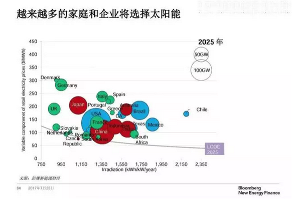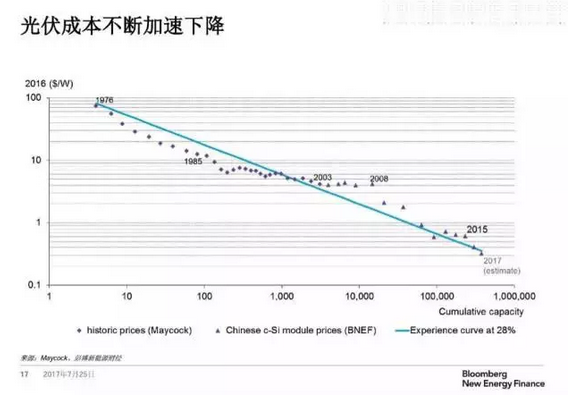 7月25日,彭博新能源财经在京举办《2017新能源展望》发布会,会上,彭博新能源财经提供出更多数据来支撑这一趋势预测——随着光伏的快速发展,太阳能发电成本不断加速下降,将更进一步加快煤电的“死亡”。