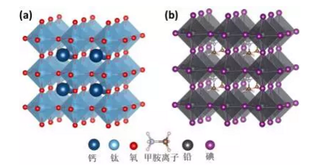 (a)钛酸钙(GaTiO3)晶体的原子结构;(b)钙钛矿太阳能中吸光层物质甲氨铅碘(CH3NH3PbI3)晶体的原子结构。