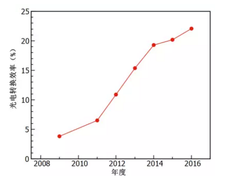 钙钛矿结构材料自2009年首次应用于光伏技术以来,短短六七年时间,在广大科研人员的努力下,它的光电转化效率就已经从3%提高到22%。