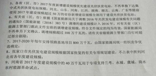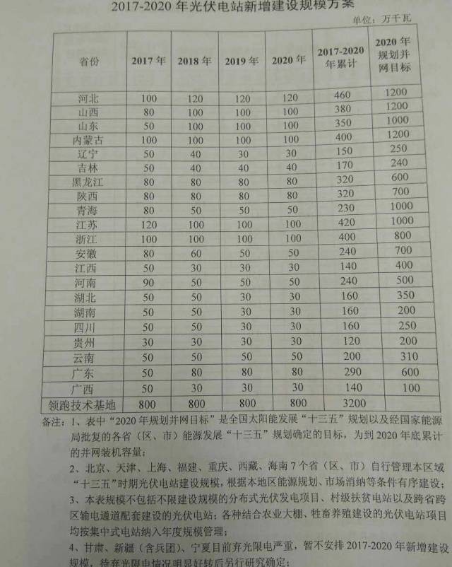 日前,国家能源局出台《关于可再生能源发展“十三五”规划实施的指导意见》,对“十三五”期间2017-2020年的光伏发展规模进行了规划。文件指出未来4年(2017-2020)国家能源局规划的普通光伏电站指标为54.5GW,领跑者项目指标为每年8GW(共计32GW)。同时规定甘肃、新疆(含兵团)、宁夏在弃光率明显好转之前不做安排;北京、上海、天津、福建、重庆、西藏、海南7个省市自行管理本区域“十三五”期间的建设指标;分布式光伏、村级扶贫电站及跨省跨区输电通道配套建设的光伏电站都不包含在本指标内。