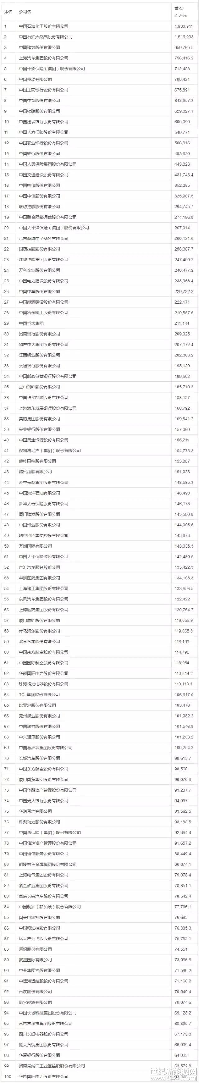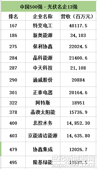 今年中国500家上榜公司的总营业收入达到了33.54万亿元,较去年大涨9%;净利润达2.8万亿元,增长约2.2%;营业收入和利润增幅较去年均有明显回升。今年企业上榜的年营收门槛为113.23亿元,首次突破百亿。其中,中国光伏企业也表现不俗。值得注意的是,中国13家光伏企业(涉足投资的企业暂除外)强势登陆了500强榜单。其中,排名最靠前的是特变电工,营收破400亿元。新奥能源和保利协鑫位列第二名和第三名。同时,协鑫集成、隆基股份两家上市公司首次进入了此榜单;通威股份和正泰电器分别从上年的367名、414名蹿升至290名、301名。
