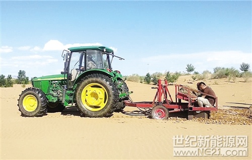 图为植树工人在演示甘草平移机械化种植技术,甘草从竖着长改为横着长,绿化覆盖面积从0.1平方米扩大到1平方米。本报记者 刘 慧摄