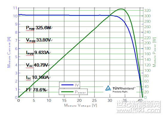 该组件选用基于量产技术、光电转换效率为21.90%的单晶PERC电池,于4月17日在TÜV莱茵上海实验室完成测试,组件开路电压与短路电流分别达到40.79V 与10.160A。