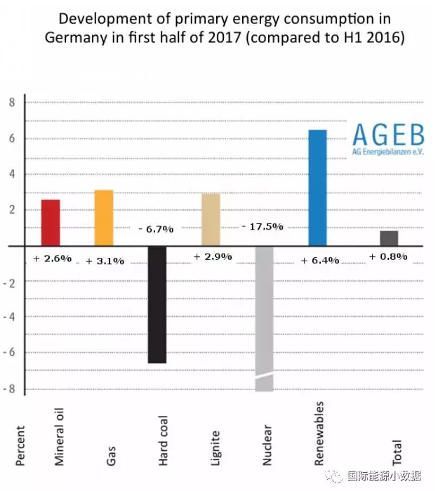 根据德国能源市场研究机构AGEB的数据,德国2017年上半年的能耗与去年同期相比上升0.8%,其中可再生能源消费上升6.4%(风电+19%,太阳能+14%,生物质+5%),核电下降17.5%,硬煤下降6.7%,褐煤上升2.9%,石油增长2.6%,天然气增长3.1%。