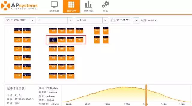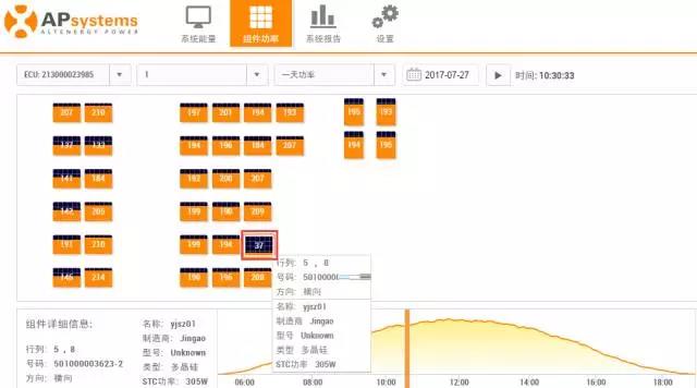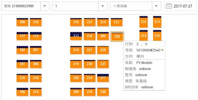 在EMA监控系统中的“组件功率”页面中,可以看到每一块组件的发电情况。单机组件示意图,将会显示组件的位置行列号以及逆变器的序列号等信息。