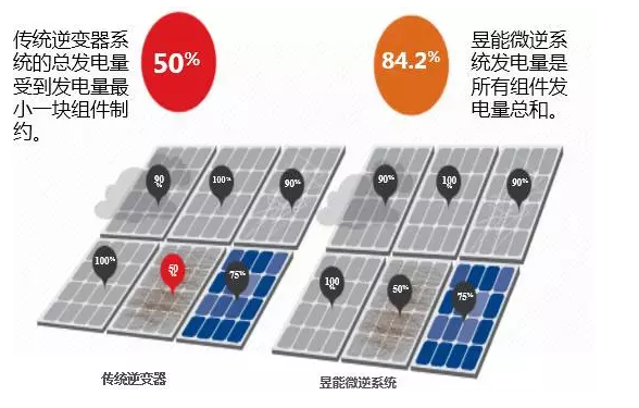 一般的组串式系统,组件之间都是串联结构,当任意一块组件发生遮挡或者出现问题时,整串组件都受到影响,系统发电量将受到很大影响。微型逆变器系统中每台逆变器都具有独立的MPPT功能,可将每块组件的输出优化在最大功率点附近。由于没有‘短板’效应,部分组件阴影遮挡并不会对整串组件的发电量造成影响,使得每块组件输出最大化。