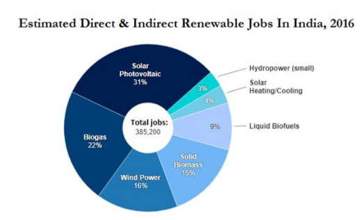 2016年,印度可再生能源装机容量占全球总量的5%,投资总额达到97亿美元,直接和间接从事可再生能源领域的人员达到830万人,与中国、巴西、美国、日本和德国一样成为全球领先的可再生能源就业市场。