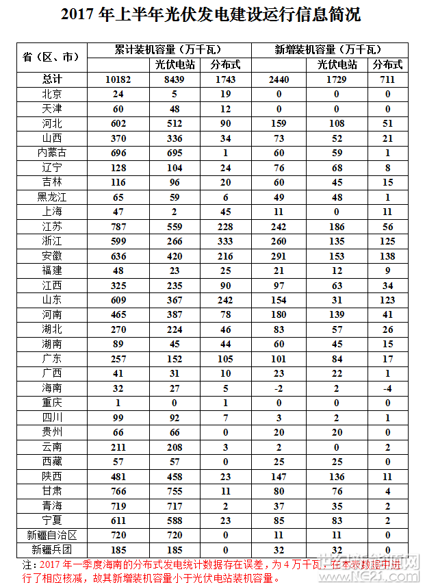 来源:世纪新能源网发布时间:2017-08-03 23:59:59 索比光伏网讯:2017年上半年,全国新增光伏发电装机容量2440万千瓦,同比增长9%,其中: