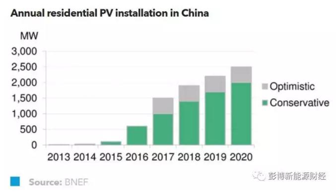 索比光伏网讯:2017年,中国的户用光伏新增装机容量会超过1GW,超过2016年为止的累计装机容量。BNEF预测,至2020年,中国的家庭屋顶光伏累计装机容量将接近10GW,至2040年将超过100GW。
