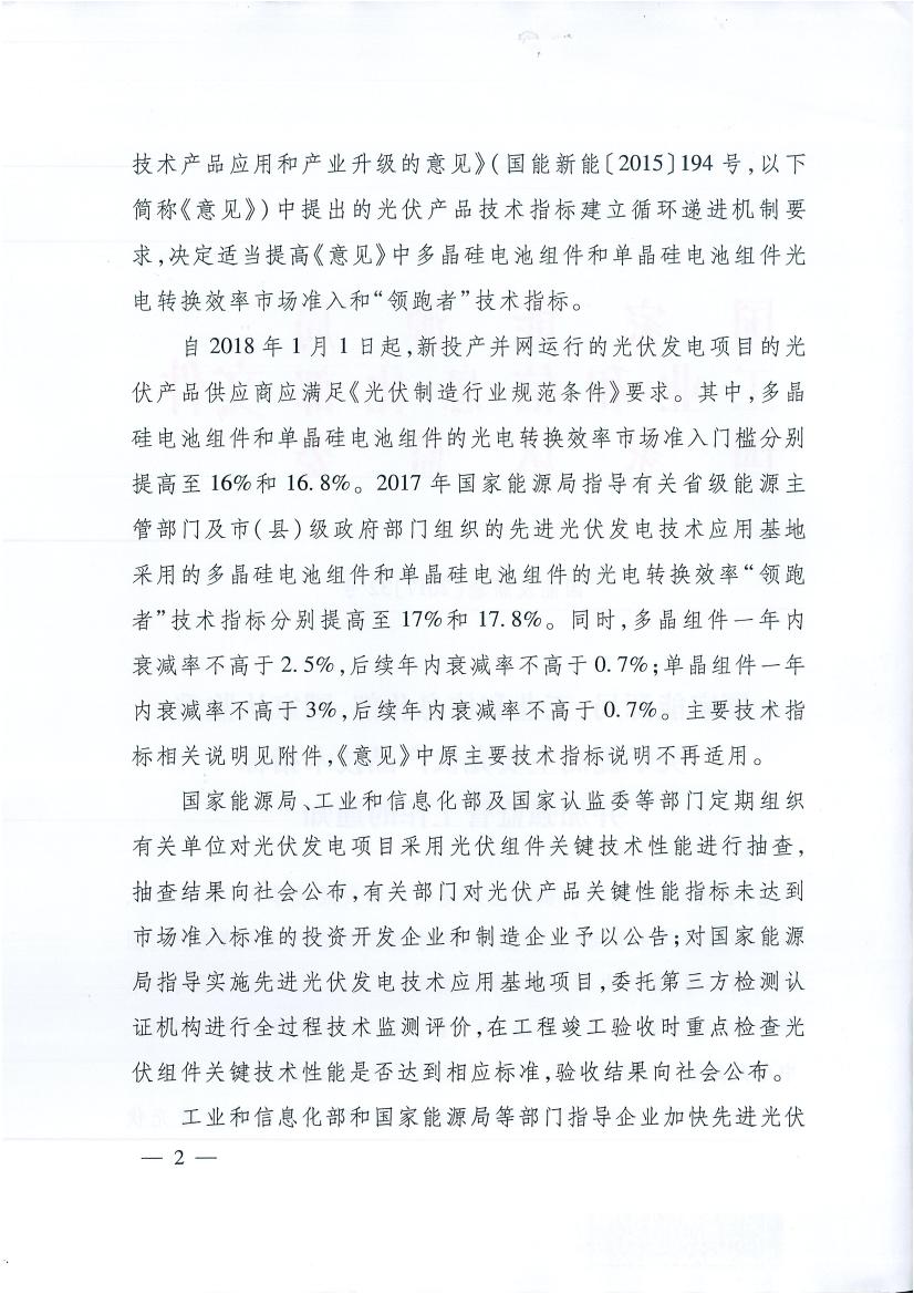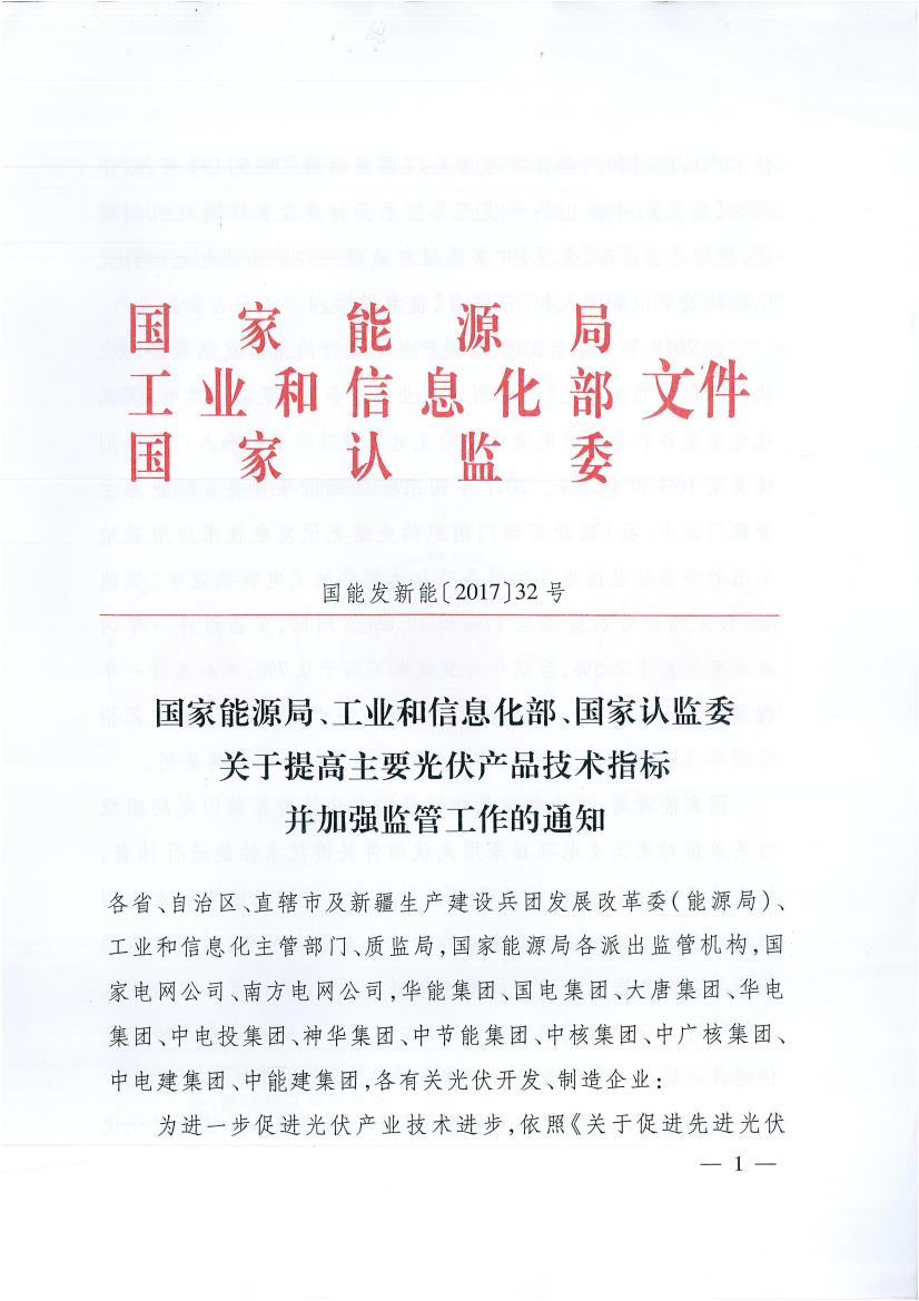 能源局、工信部、认监委正式发布关于提高主要光伏产品技术指标并加强监管工作的通知