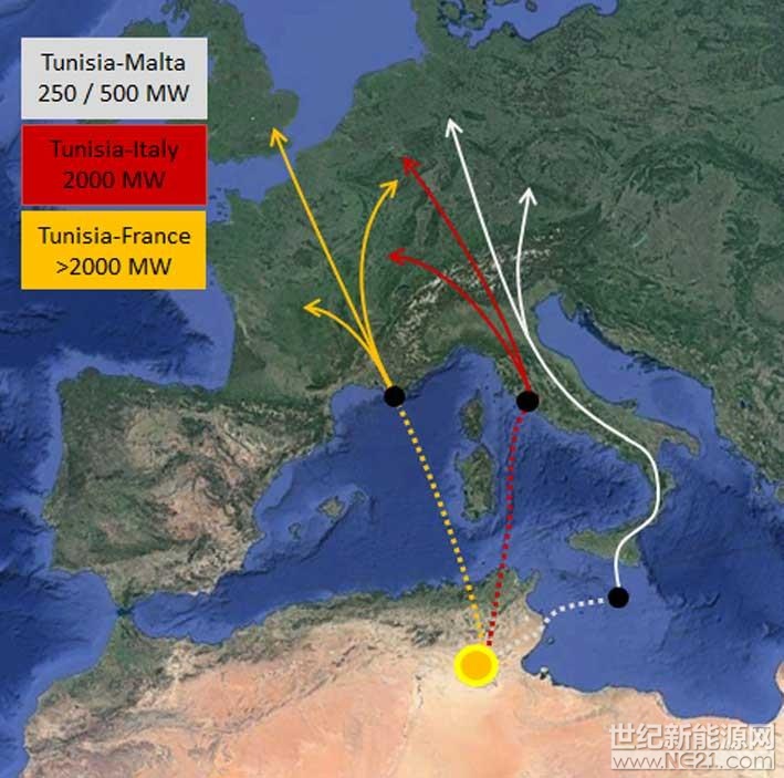 TuNur计划通过三条高压直流海底电缆出口太阳能。第一阶段项目将是突尼斯-马耳他海底电缆。