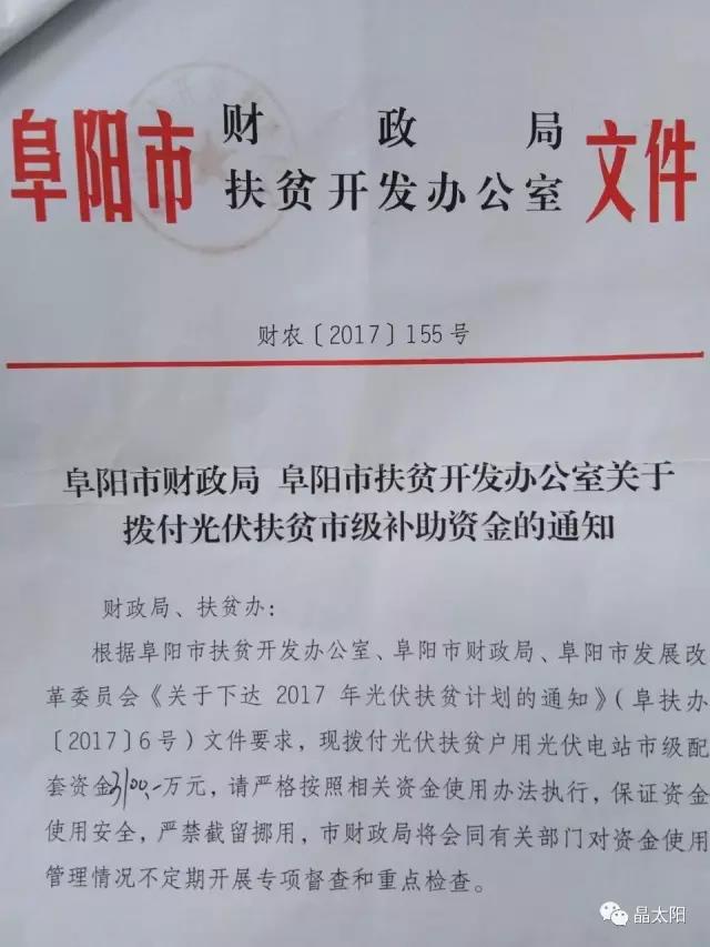 安徽阜阳:关于拨付光伏扶贫市级补助资金的通知