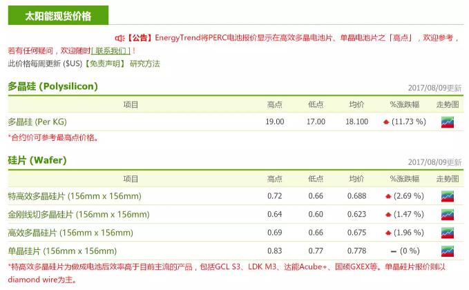 组件端在中国本土需求并不急迫的状况下,价格持稳较为吃力;反观美国即将进入需求高峰期,非中国组件价格仍有向上走高的空间。由于201案将在9月22日宣布ITC的初步调查结果,市场一般认定需要在此前将组件进关以规避可能的风险,算入海运时间的话8月底会是最晚期限,预期终端价格可以因此加温,并拉动中国一线组件厂的产能利用率。