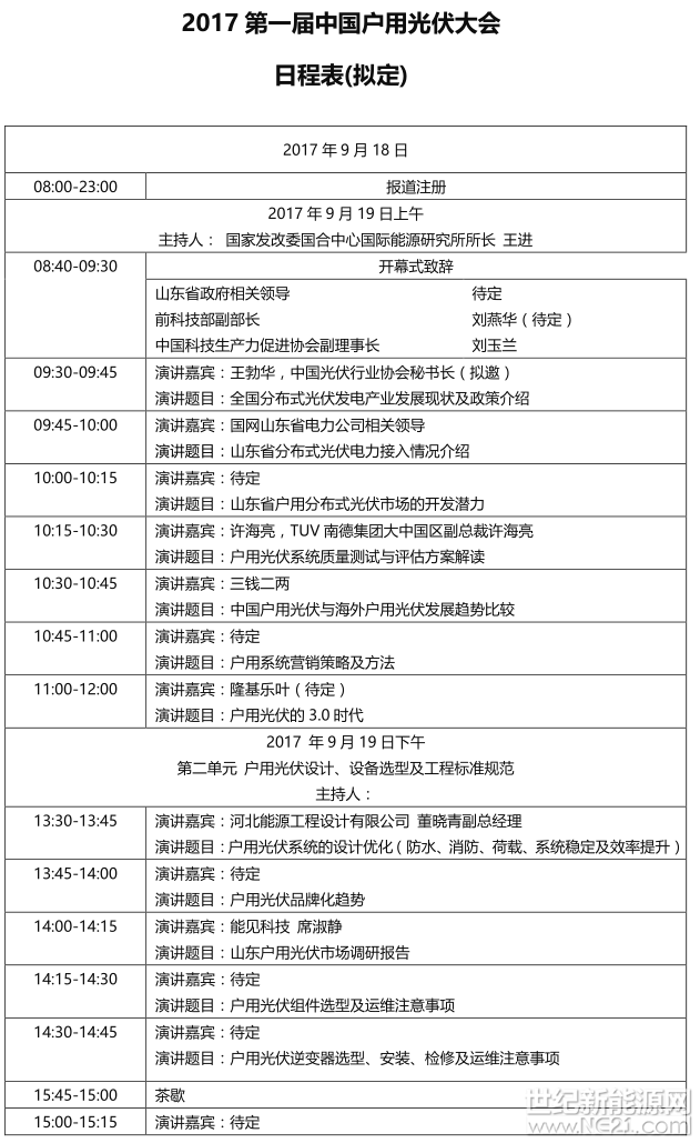 中国生产力促进中心协会光伏专业委员会中国光伏行业协会(拟邀)日期: 2017年9月19日(周二) 地点:山东省济南市 媒体支持:中国能源报、世纪新能源网、太阳能发电杂志、光伏时代、能见、PV-Tech、光伏們、第一财经、能源杂志等 联合承办:世纪新能源网、全民光伏PV Plus