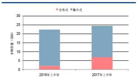 根据能源局数据,2017年上半年,全国光伏发电新增装机达到24.4GW,同比增加9%,超过去年的上半年的高点,远远好于业内年初的预期。今年第一季度分布式光伏新增装机2.43GW,与2016年同期相比增长151%,而集中式电站降23%。进入抢装期的第二季度,业内人士统计,分布式光伏在四、五月的新增装机占比分别达到44.7%和40.4%,前5个月新增装机规模超4GW,不到半年时间完成了2016年全年的分布式光伏增长量,且6月仍有成倍增长。