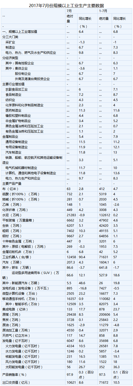 据国家统计局最新数据显示,2017年7月规模以上工业增加值同比实际增长6.4%(以下增加值增速均为扣除价格因素的实际增长率)。1-7月份,规模以上工业增加值同比增长6.8%。其中,2017年7月份我国太阳能发电量56亿千瓦时,同比增长26.7%。1-7月份,我国太阳能发电量共计352亿千瓦时,同比增长36.3%。