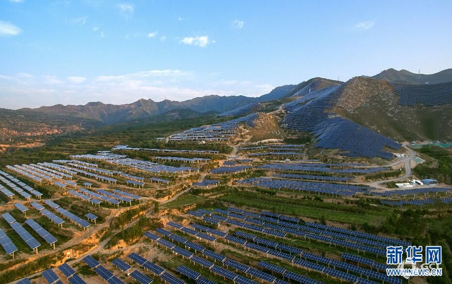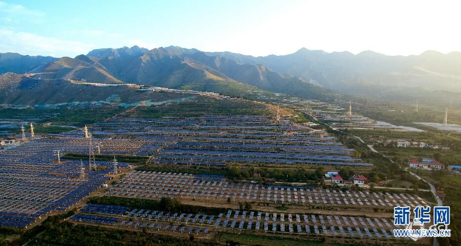 放眼远眺中条山南麓 蓝色光伏板已排起了庞大阵列,扮靓了整个山坡。新华网发(余味摄)