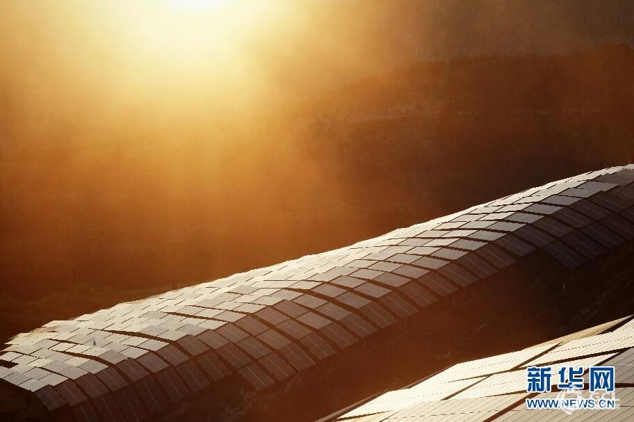 一排排淡蓝色的光伏板在阳光的照射下闪着耀眼的光芒。新华网发(余味摄)