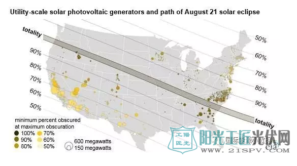 日食除了带来了旅游热以外,还受到电力部门的密切关注,因为日食将造成光伏电站的发电能力在短时间内下降甚至消失,对于电网的稳定带来压力。由于美国光伏比例仍然很小,所以美国电网的稳定性不会受到大的影响。但是,美国电力监管机构和各电网运行商抓住难得的机会进行实兵演练。受到日食影响最大的是加利福尼亚州,电网运行商已经做好准备安排6000兆瓦的天然气、水电电源,填补因为日食失去的光伏出力。
