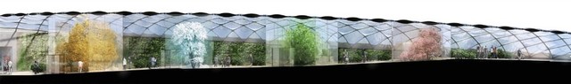 意大利建筑师CarloRatti用太阳能屋顶做了一栋四季花园的模型。四季花园是一条封闭的凉亭走廊,游客穿过的时候能体验到由春天到冬天的四季变换。