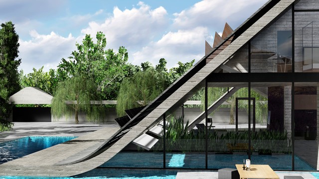 作为超现代的社区群落,绿色社区在造型上也采用更现代化的设计,全部做成倾斜的屋顶,45度倾斜于水平地面,确保自然光的吸纳及太阳能面板的利用率,满足多功能社区的需求。