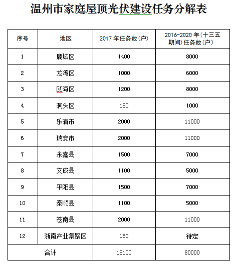 (一)明确目标任务。省政府下达给温州市五年(2016-2020)家庭屋顶光伏工程建设任务8万户,2017年下达温州市家庭屋顶光伏建设任务1.5万户。根据各县(市、区)人口家庭户数和发展条件,现将全市建设任务分解落实到各县(市、区)政府(见附件1);同时,根据市级相关部门的工作职责,把相关工作和建设任务分解到市各相关职能部门(见附件2)。