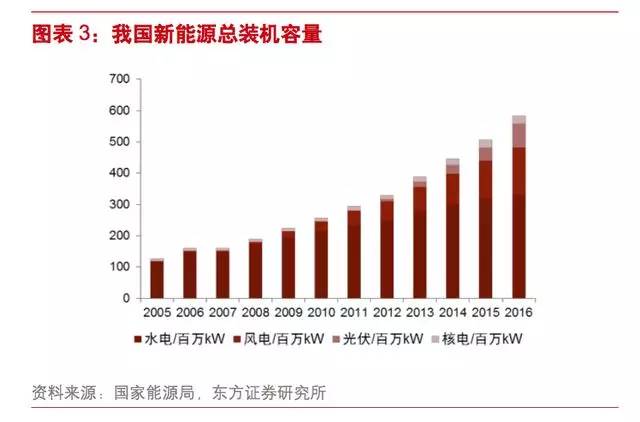2016 年可再生能源总装机容量达到 584GW(含水电,其中风电、光伏及核电合计装机量 252GW),2005 至 2016年可再生能源总装机量 CAGR 达到 15%(其中风电、光伏及核电等新能源装机容量 CAGR 为 34%)。