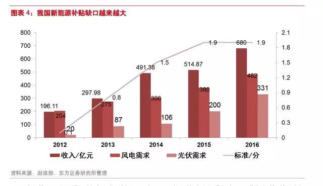 2016 年预计征收额可达到 1100 亿元,但实际征收额不足 700 亿元。随着风电及光伏发电行业上网电量不断扩大,补贴基金面临巨大的资金缺口。2016 年全年可再生能源电价补贴缺口超过 100 亿元,累计缺口超过 600 亿元。
