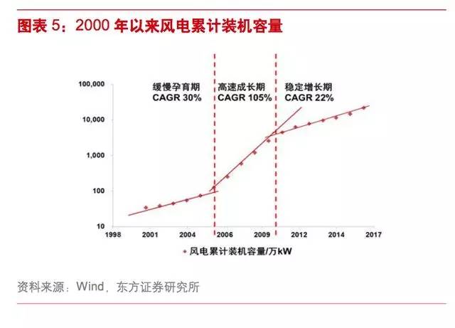 2006 至 2009 年期间风电装机容量连续 4 年实现翻倍增长,2006 到2010 年 CAGR 达到 105%,政策扶持是该阶段行业发展的核心驱动力。