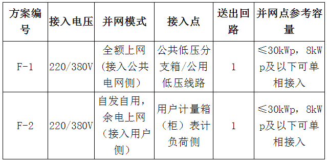 5.1.1 家庭屋顶光伏可选择“全额上网”或“自发自用,余电上网”的并网模式,根据接入容量、接入电压等级、接入方式等确定接入系统方案。