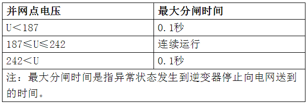 6.3.8 接入电网的家庭屋顶光伏电源在并网点处电网电压、频率异常时,家庭屋顶光伏逆变器的响应要求见表4(三相380V)、表5(单相220V)。