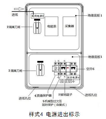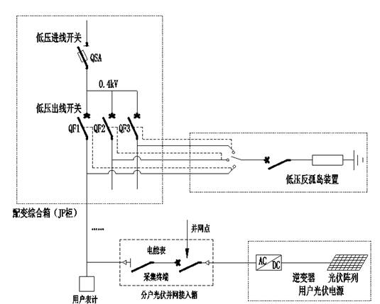 家庭屋顶光伏并网点处需加装光伏并网接入箱。箱内选用光伏并网专用断路器,预留计量表计、采集终端安装位置。