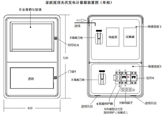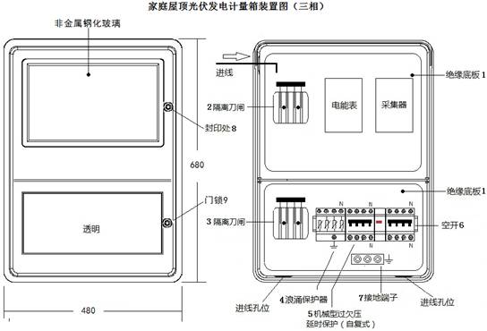 6.5.4 家庭屋顶光伏应采用适用于民用住宅建筑等环境安装的专用发电计量箱,产品应符合GB7251.3-2006标准。箱体材料选用SMC玻璃钢材质(厚度不低于2.5mm),观察窗采用非金属钢化玻璃材料,箱体应具有较强的封闭性并满足智能封印加封的要求。单相外型尺寸不小于53Omm×410mm×137mm,三相外型尺寸不小于680mm×480mm×180mm.