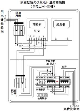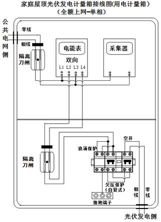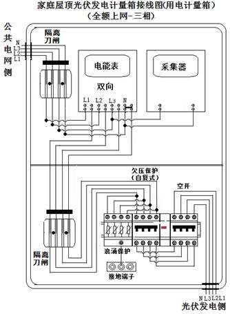 本方案主要适用于全额上网(接入公共低压分支箱或公用低压线路)的家庭屋顶光伏发电,并网点为发电计量箱(柜)﹝即为用电计量箱(柜)﹞,装机容量小于等于30kWp且大于8kWp,应采用三相接入;装机容量8kWp及以下,可采用单相接入。如图1所示;