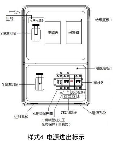 1绝缘安装底板2进线隔离刀闸3出线隔离刀闸4浪涌保护器5机械型过欠压延时保护(自复式)6出线断路器(空开)7接地端子(铜排)8封印处9门锁