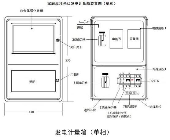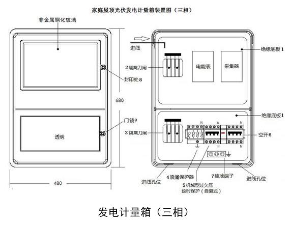 6.5.4家庭屋顶光伏应采用适用于民用住宅建筑等环境安装的专用发电计量箱,产品应符合GB7251.3-2006标准。箱体材料选用SMC玻璃钢材质(厚度不低于2.5mm),观察窗采用非金属钢化玻璃材料,箱体应具有较强的封闭性并满足智能封印加封的要求。单相外型尺寸不小于53Omm×410mm×137mm,三相外型尺寸不小于680mm×480mm×180mm.