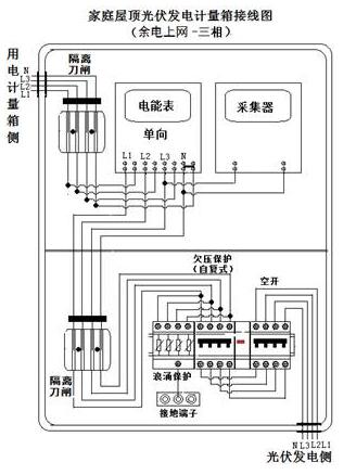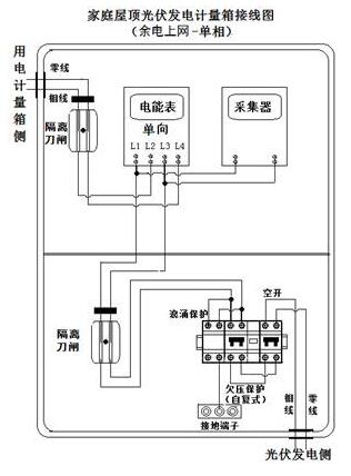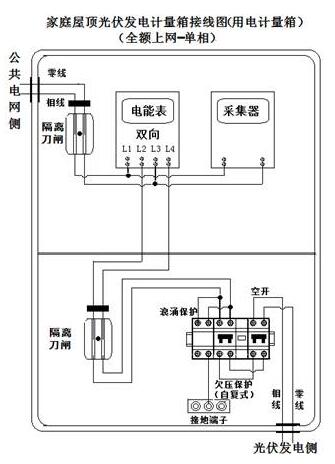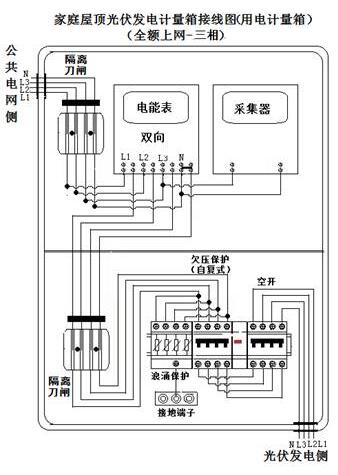 本方案主要适用于全额上网(接入公共低压分支箱或公用低压线路)的家庭屋顶光伏发电,并网点为发电计量箱(柜)﹝即为用电计量箱(柜)﹞,装机容量小于等于30kWp且大于8kWp,应采用三相接入;装机容量8kWp及以下,可采用单相接入。如图1所示;