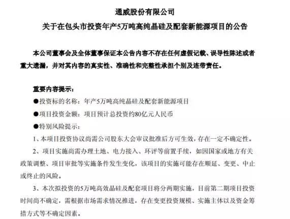 而其实,通威股份很早就在布局另一个产业,就是光伏产业。早在2007年,通威便涉足光伏行业的上游,多晶硅,而近日,通威又发了公告,计划投资80亿,建立5万吨多晶硅的产能。