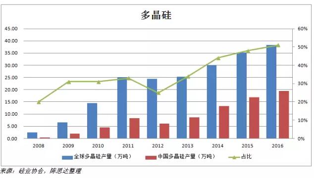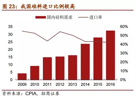 即便是这样的情况下,由于硅片产量90%以上聚集在中国,所以2016年我国多晶硅进口率仍然高达40%以上。