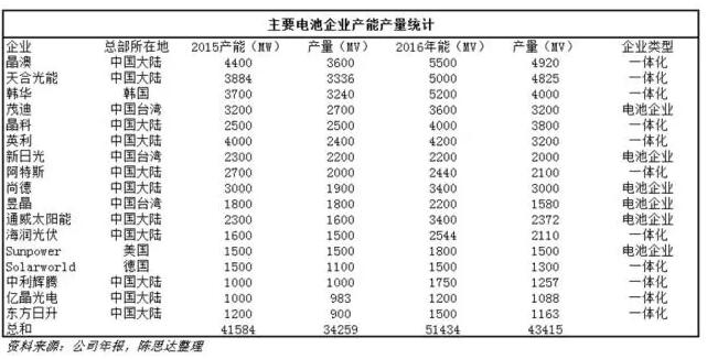 对于电池片环节,行业格局一直比较分散,而其中的企业主要包括的是两类,一类是组件一体化的电池企业,如天合,晶科,晶澳等,而其大部分是自用,而另一类是纯电池片企业,主要以台湾企业居多,如茂迪,新日光,昱晶等,其电池片主要出口给我国的组件企业。