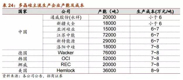 而基于这两个方面,国内大多企业成本低于海外企业,海外企业多晶硅生产现金成本在7-8万元/吨左右,而国内企业基本都低于海外企业,通威股份多晶硅生产成本都降至6万元/吨以下,能够做到成本领先。