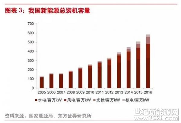 2016年可再生能源总装机容量达到584GW(含水电,其中风电、光伏及核电合计装机量252GW),2005至2016年可再生能源总装机量CAGR达到15%(其中风电、光伏及核电等新能源装机容量CAGR为34%)。