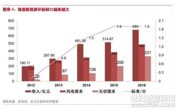 2016年预计征收额可达到1100亿元,但实际征收额不足700亿元。随着风电及光伏发电行业上网电量不断扩大,补贴基金面临巨大的资金缺口。2016年全年可再生能源电价补贴缺口超过100亿元,累计缺口超过600亿元。