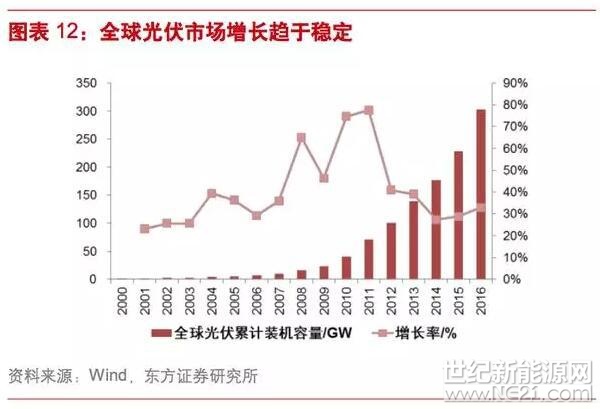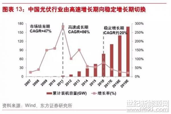 虽然光伏补贴存在退坡现象,但成本端的同步下调一定程度上保证了光伏电站的整体收益,加之在每次补贴退坡新政执行日期前出现的“抢装潮”现象,2014年以后光伏行业增长速度并没有出现明显下滑。