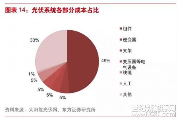 光伏系统成本主要包括组件、逆变器、支架、变压器、线缆、建筑工程费用、项目征地费用等,其中太阳能电池组件费用占整体成本的50%左右,BOS成本占比(包含控制器、支架、逆变器、蓄电池、线缆等)接近30%,其他成本包括土地、基础建设和EPC费用等。