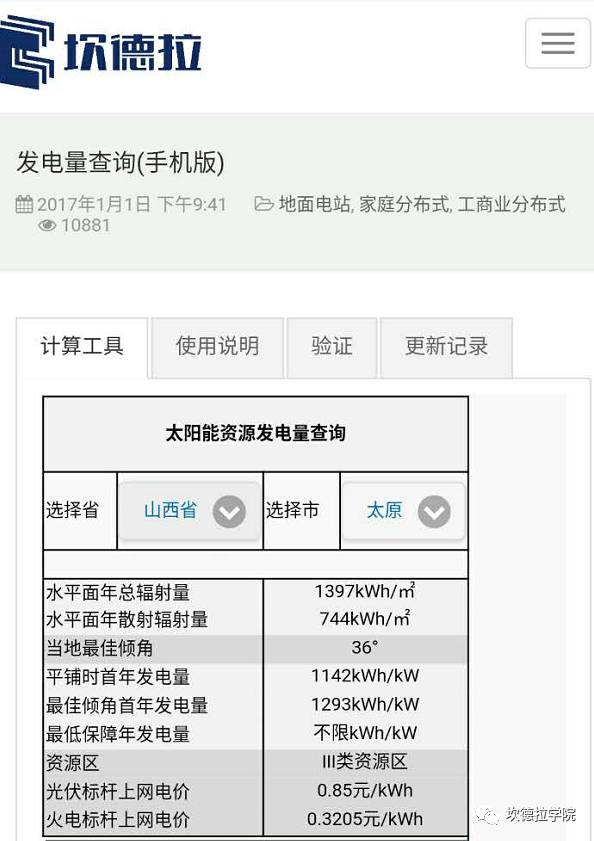 通过坎德拉的在线工具查询到太原地区最佳倾角下每千瓦首年理论发电量为1293度电。