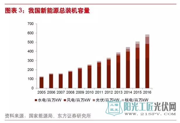 2016年可再生能源总装机容量达到584GW(含水电,其中风电、光伏及核电合计装机量252GW),2005至2016年可再生能源总装机量CAGR达到15%(其中风电、光伏及核电等新能源装机容量CAGR为34%)。