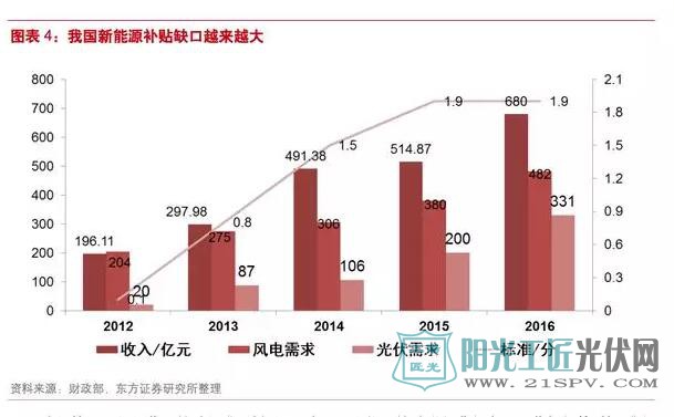 2016年预计征收额可达到1100亿元,但实际征收额不足700亿元。随着风电及光伏发电行业上网电量不断扩大,补贴基金面临巨大的资金缺口。2016年全年可再生能源电价补贴缺口超过100亿元,累计缺口超过600亿元。